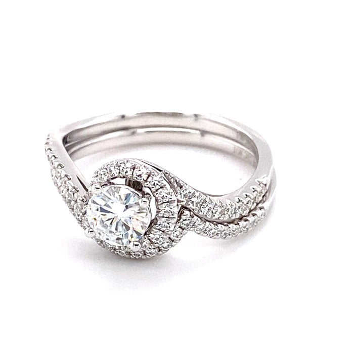 This beautiful bypass halo engagement ring, set in shining 14k white gold, features round moissanite gemstones, totaling a diamond equivalent weight of 1.18 carats.