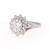 Featuring 25 shining moissanite gems, this splendid oval halo ring weighs in at 1.98 diamond equivalent carats and is set in a sterling silver four-prong setting.