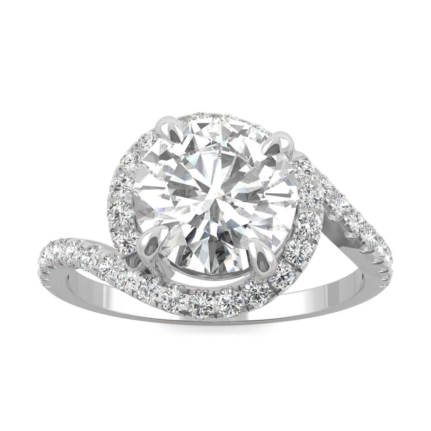 At once classic and unique, this halo engagement ring has a bypass design that highlights an 8mm moissanite at the center. Surrounded in petite accent stones and carrying a total diamond equivalent weight of 2.24ct, this 14k white gold ring will take her breath away.