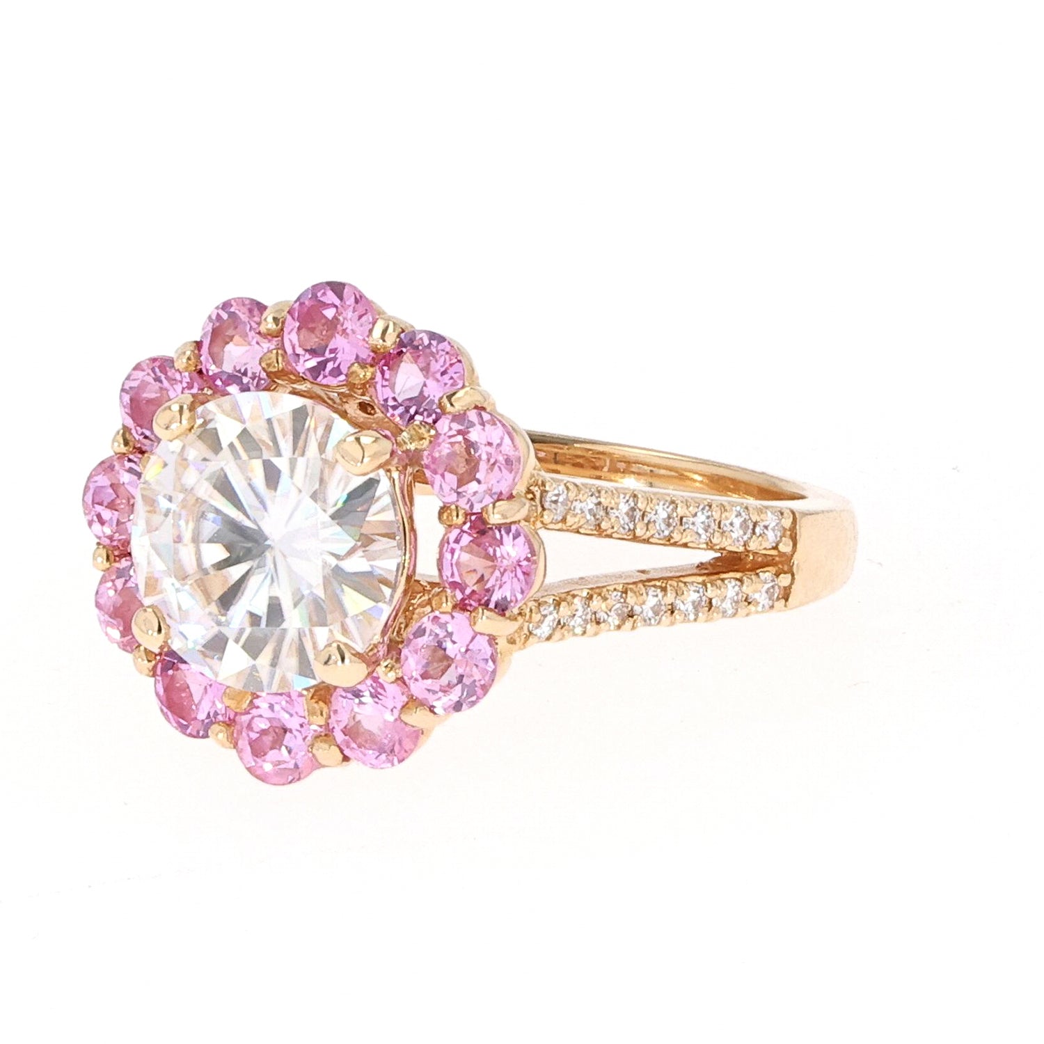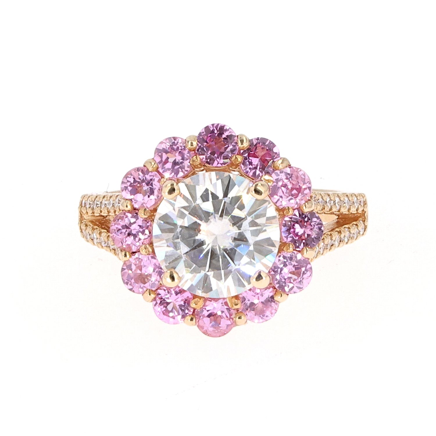 So bold! This 14k yellow gold ring is the perfect addition to any jewelry box. Coming in at 5.18 carats of diamond equivalent weight from forty nine moissanite gemstones, look no further!