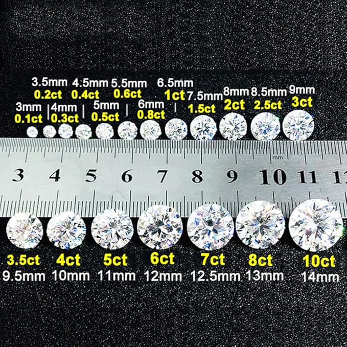Carat weight and measurements of moissanite: 1ct=6.5mm,1.2ct=7.0mm,1.5ct=7.5mm,2ct=8.0mm,2.5ct=8.5mm,3ct=9.0mm,3.5ct=9.5mm,4ct=10.0mm,4.5ct=10.5mm,5ct=11.0mm,6ct=12.0mm